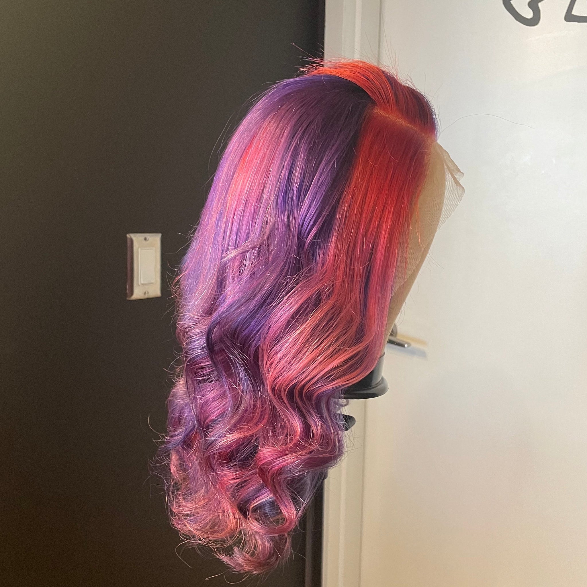 Purple with Two Red Orange to Pink Ombre Streaks and Matching Peekaboo